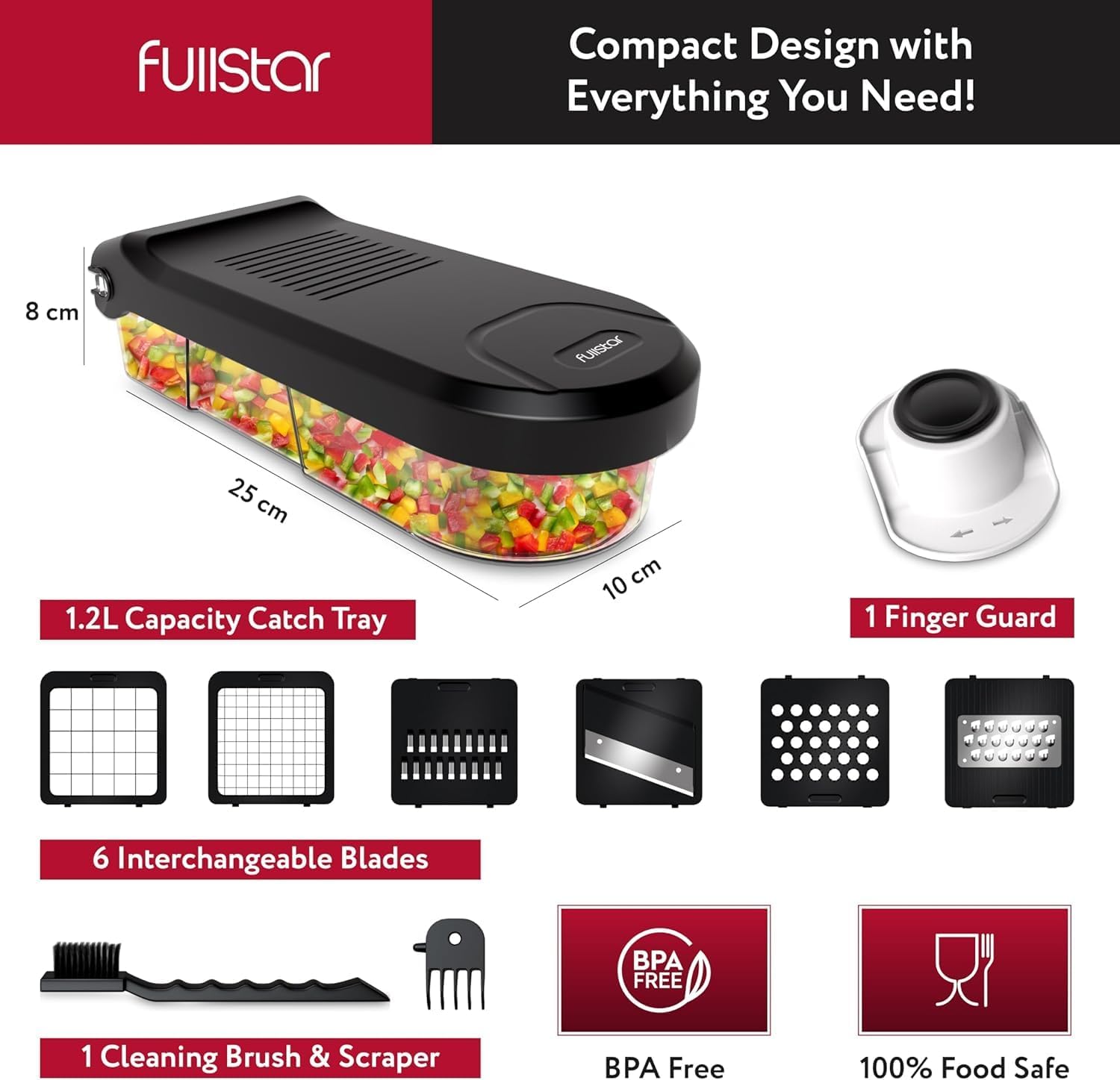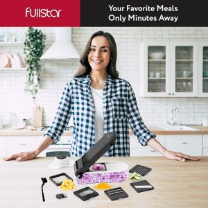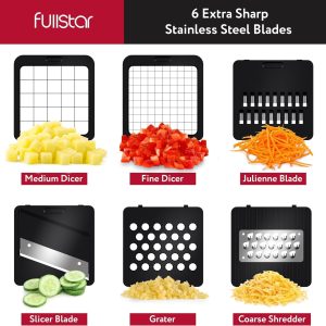 - Great Value & Quality – The Fullstar vegetable chopper is an affordable mandoline slicer and cheese grater that doesn’t compromise on quality. It includes 6 stainless steel blades. 1 cleaning brush. 1 finger guard. and a 1.2L container for safe and efficient meal prepping.